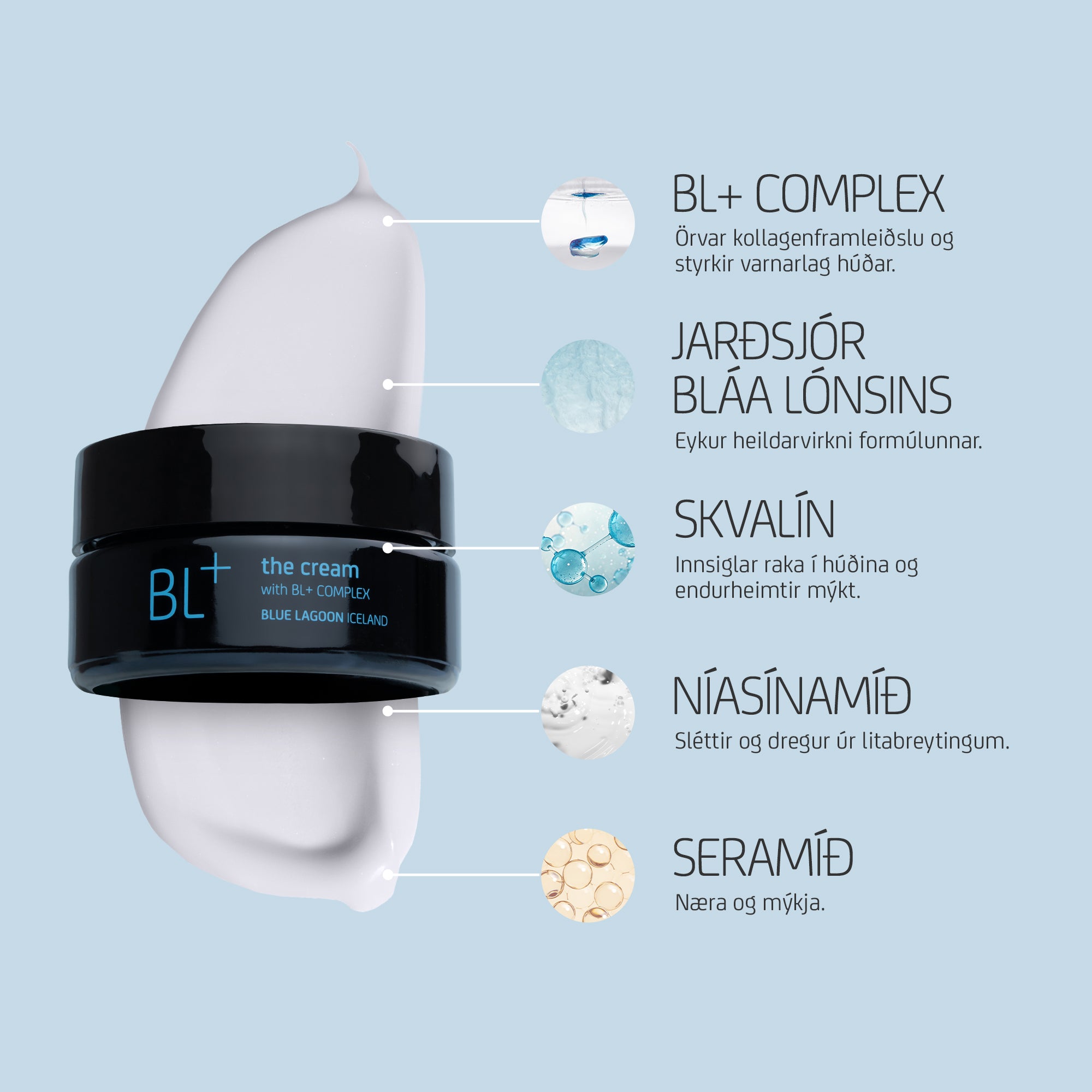 Ríkulegt og nærandi andlitskrem þróað til að veita húðinni raka, dregur úr sýnileika fínna lína og eykur þéttleika. Formúla BL+ The Cream inniheldur einstaka samsetningu lífvirkra efna sem næra, auka raka, örva kollagenframleiðslu í húð, draga úr niðurbroti kollagens, slétta áferð og endurheimta þéttleika húðarinnar ásamt því að styrkja varnarlag hennar.